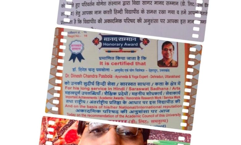 देहरादून। काशी हिन्दी विद्यापीठ, वाराणसी, उत्तर प्रदेश द्वारा डॉ० डी० सी० पसबोला को उच्च मानद डॉक्टरेट (Higher Honorary – D Litt) के लिए नामित किया है। विद्यापीठ की अकादमिक परिषद की अनुशंसा के पश्चात कुलपति डॉ० संभाजी राजाराम बाविस्कर के अनुमोदन के पश्चात उप कुलपति एवं कार्यक्रम संयोजक डॉ० योगेश त्रेहन द्वारा इस सम्बन्ध में पत्र जारी कर दिया गया था।