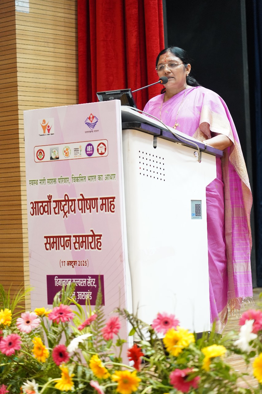 आठवें राष्ट्रीय पोषण माह 2025 का समापन समारोह शुक्रवार को हिमालयन कल्चरल सेण्टर, देहरादून में आयोजित किया गया। इस अवसर पर भारत सरकार की महिला एवं बाल विकास राज्य मंत्री श्रीमती सावित्री ठाकुर मुख्य अतिथि के रूप में उपस्थित रहीं। यह आयोजन पोषण जागरूकता, सामुदायिक सहभागिता और व्यवहार परिवर्तन को समर्पित एक माह लंबे जन आंदोलन के समापन का प्रतीक रहा। समारोह में उत्तराखंड की महिला सशक्तिकरण एवं बाल विकास मंत्री श्रीमती रेखा आर्या, उत्तराखंड के कृषि एवं ग्राम्य विकास मंत्री श्री गणेश जोशी, भारत सरकार के महिला एवं बाल विकास मंत्रालय के अतिरिक्त सचिव श्री लव अग्रवाल, उत्तराखंड महिला सशक्तिकरण एवं बाल विकास विभाग के सचिव श्री चंद्रेश कुमार यादव तथा महिला एवं बाल विकास मंत्रालय भारत सरकार की संयुक्त सचिव श्रीमती राधिका झा भी उपस्थित रहीं।