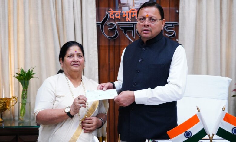 देहरादून।सुप्रसिद्ध पर्वतारोही एवं पद्मभूषण सम्मान प्राप्त बछेंद्री पाल ने आज मुख्यमंत्री राहत कोष हेतु ₹10 लाख का चेक प्रदान किया। यह चेक उनकी ओर से राज्य महिला उद्यमिता परिषद की उपाध्यक्ष श्रीमती विनोद उनियाल द्वारा मुख्यमंत्री श्री पुष्कर सिंह धामी जी को सौंपा गया।