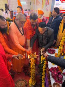 🌸मंच पर सनातन धर्म के प्रतिष्ठित संत-महापुरुषों, महामंडलेश्वरों एवं राष्ट्रसेवकों की उपस्थिति ने कार्यक्रम की गरिमा को और अधिक बढ़ा दिया। मंचासीन प्रमुख संतों एवं अतिथियों में अखिल भारतीय अखाड़ा परिषद के अध्यक्ष एवं माँ मनसा देवी मंदिर ट्रस्ट के अध्यक्ष पूज्य श्री महंत स्वामी रविन्द्र पूरी जी महाराज, निरंजन पीठाधीश्वर श्री श्री 1008 आचार्य महामंडलेश्वर पूज्य डॉ. स्वामी कैलाशानन्द गिरि जी महाराज, उत्तराखंड के पूर्व मुख्यमंत्री एवं महाराष्ट्र के पूर्व राज्यपाल आदरणीय भगत सिंह कोश्यारी जी, महामंडलेश्वर पूज्य ललितानंद गिरि जी महाराज, महामंडलेश्वर पूज्य स्वामी रूपेंद्र प्रकाश जी महाराज, महामंडलेश्वर पूज्य स्वामी शाश्वतानंद जी महाराज, नैनीताल के सांसद आदरणीय श्री अजय भट्ट जी, पूर्व कैबिनेट मंत्री स्वामी यतीश्वरानंद जी महाराज जैसी विशिष्ट विभूतियाँ प्रमुख रूप से सम्मिलित रहीं।🌸
