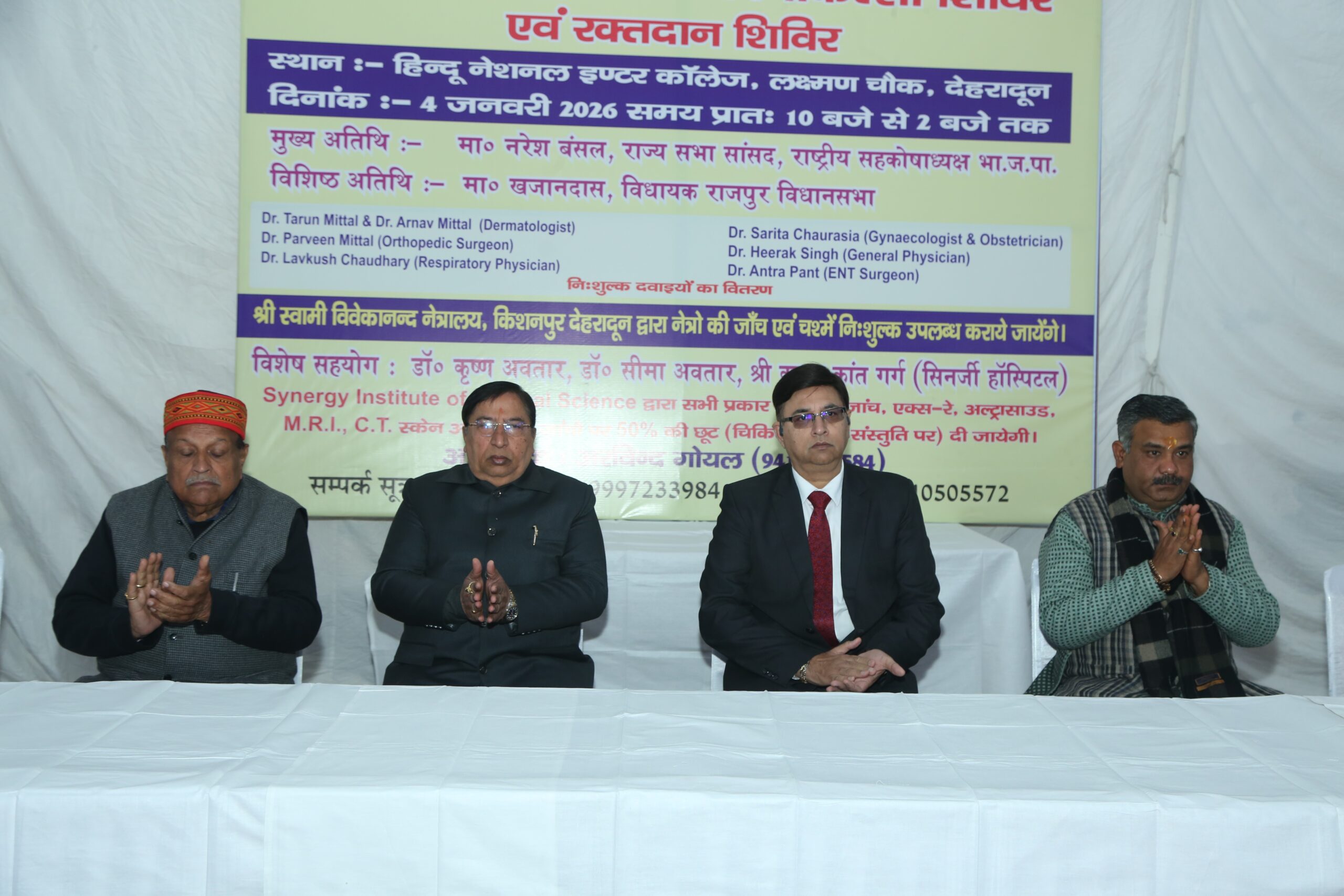 निःशुल्क स्वास्थ्य शिविर में सिनर्जी अस्पताल के निदेशक डॉ. कृष्ण अवतार, डॉ. सीमा अवतार, डॉ. प्रवीण मित्तल, डॉ. लवकुश चौधरी, डॉ. तरुण मित्तल, डॉ. सरिता चौरसिया, डॉ. हीरक सिंह, डॉ. अर्णव मित्तल, डॉ. अंतरा पंत सहित स्वामी विवेकानंद नेत्र चिकित्सालय के नेत्र रोग विशेषज्ञ डॉ. प्रशांत लूथरा द्वारा कुल 158 मरीजों का स्वास्थ्य परीक्षण कर उन्हें निःशुल्क दवाइयां उपलब्ध कराई गईं। शिविर में नेत्र रोग, हड्डी रोग, स्त्री रोग, चर्म रोग, स्किन रोग एवं शुगर रोग से संबंधित उपचार किए गए, जिसकी मरीजों ने भूरि-भूरि प्रशंसा की।