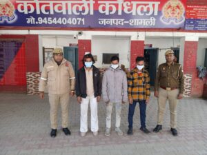 इसी क्रम में पुलिस अधीक्षक शामली एन. पी. सिंह के आदेशानुसार चलाए जा रहे संदिग्ध वाहन/व्यक्ति चेकिंग अभियान के क्रम में, अपर पुलिस अधीक्षक सुमित शुक्ला के निर्देशन एवं क्षेत्राधिकारी कैराना के कुशल नेतृत्व में थाना कांधला पुलिस द्वारा थाना क्षेत्रान्तर्गत बिजली घर रोड़ पर एक व्यक्ति के साथ मारपीट करने के मामले में वांछित साकिर पुत्र सलीम , खालिद पुत्र सलीम व फरमान पुत्र सलीम निवासी नई बस्ती बिजली घर रोड़ नामक अभियुक्तों को गिरफ्तार करने में महत्वपूर्ण सफलता प्राप्त हुई है । गिरफ्तारी के सम्बन्ध में थाना कांधला पर अग्रिम वैधानिक कार्यवाही की जा रही है।