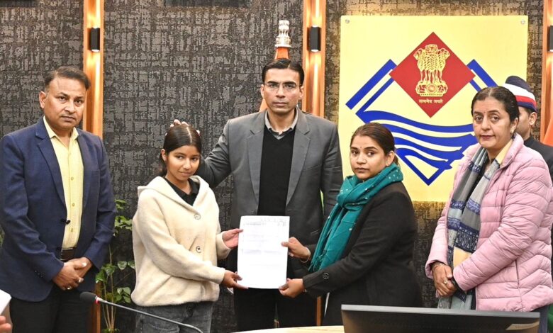 देहरादून 09 जनवरी 2026 । जिलाधिकारी सविन बंसल विषम परिस्थितियों से जूझ रही होनहार बेटियों की शिक्षा को पुनर्जीवित कर उनके उज्ज्वल भविष्य का मार्ग प्रशस्त कर रहे हैं। जिला प्रशासन ऐसे परिवारों के लिए संबल बनकर उभर रहा है, जहाँ संसाधनों की कमी के बावजूद बेटियों के सपनों में उड़ान भरने का जज़्बा मौजूद है।जिला प्रशासन बेटियों की शिक्षा को नया जीवन दे रहा है। इसी क्रम में जिलाधिकारी द्वारा जीविका अंथवाल (बी.कॉम द्वितीय वर्ष) एवं नन्दिनी राजपूत (कक्षा 11) को सीएसआर फंड से 1-1 लाख रुपये की आर्थिक सहायता प्रदान की गई है। दोनों बेटियों की शिक्षा को विगत सप्ताह प्रोजेक्ट ‘नंदा-सुनंदा’ के माध्यम से पुनर्जीवित की गई है।