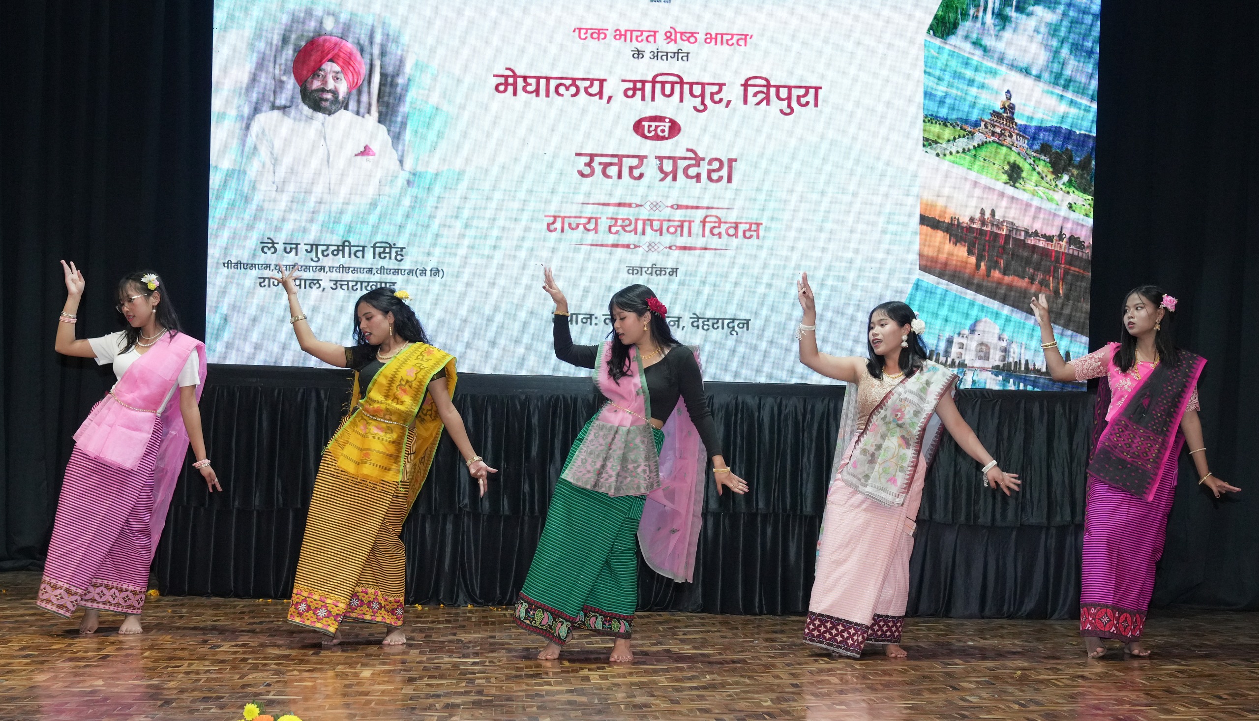 ‘एक भारत–श्रेष्ठ भारत’ कार्यक्रम के अंतर्गत गुरुवार को लोक भवन, देहरादून में उत्तर प्रदेश, त्रिपुरा, मणिपुर एवं मेघालय के राज्य स्थापना दिवस उत्साहपूर्वक मनाए गए। इस अवसर पर संबंधित राज्यों से आए कलाकारों ने अपनी-अपनी संस्कृति, लोक परंपराओं और सांस्कृतिक विरासत पर आधारित रंगारंग प्रस्तुतियां दीं, जिनमें भारत की विविधता में निहित एकता सजीव रूप में दिखाई दी।
