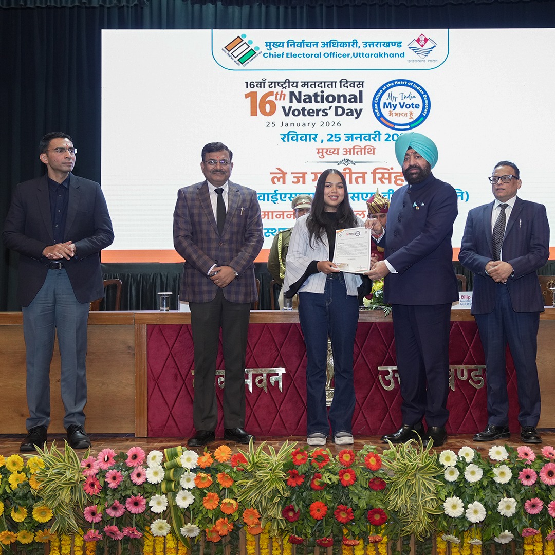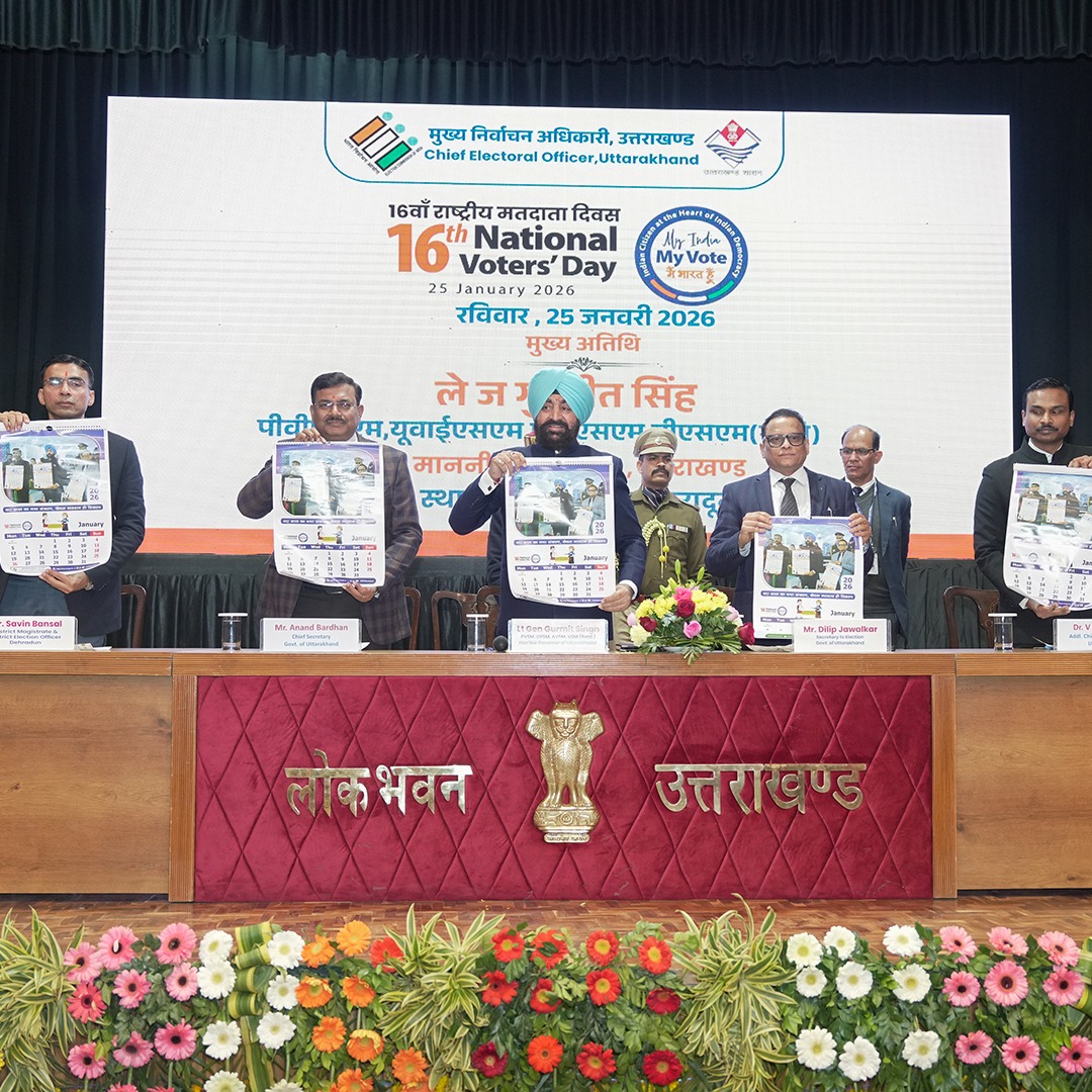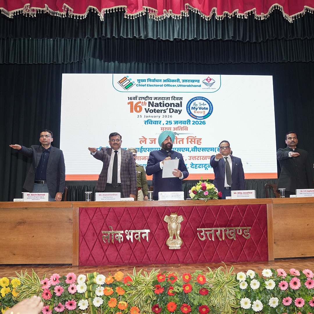 लोक भवन, देहरादून 25 जनवरी,2026। 16वें राष्ट्रीय मतदाता दिवस के अवसर पर रविवार को लोक भवन, देहरादून में राज्य स्तरीय कार्यक्रम का आयोजन किया गया। कार्यक्रम के मुख्य अतिथि राज्यपाल लेफ्टिनेंट जनरल गुरमीत सिंह (से नि) रहे। इस अवसर पर मुख्य सचिव श्री आनंद बर्द्धन, सचिव निर्वाचन श्री दिलीप जावलकर, अपर मुख्य निर्वाचन अधिकारी डॉ. विजय कुमार जोगदंडे एवं जिलाधिकारी देहरादून श्री सविन बंसल मंच पर उपस्थित रहे।
