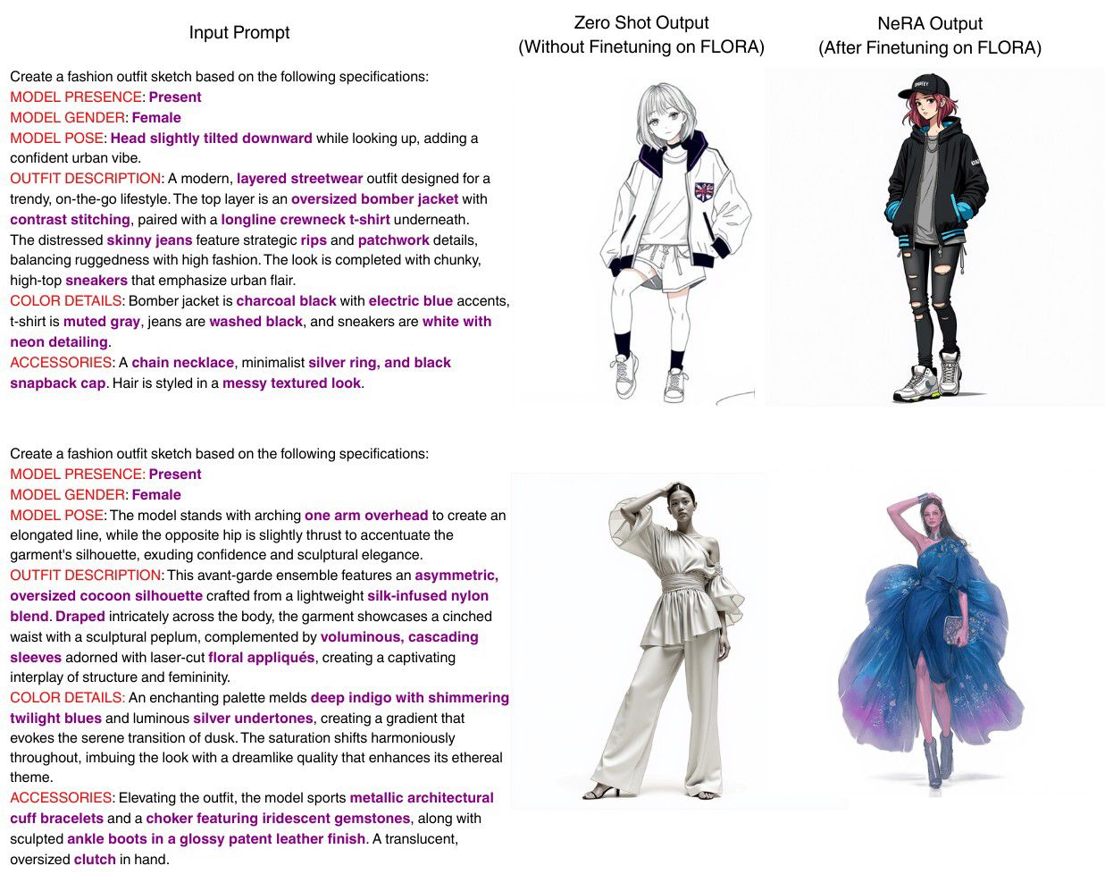 वर्तमान में उपलब्ध अधिकांश फैशन डेटासेट फोटोग्राफ या कैटलॉग छवियों पर आधारित होते हैं। ये ऑनलाइन खरीदारी मंचों के लिए उपयोगी हैं, किंतु वे उन स्केचों को प्रतिबिंबित नहीं करते, जिन्हें डिज़ाइनर सामान्यतः अपनी स्केचबुक में बनाते हैं। फ्लोरा इस दृष्टि से विशिष्ट है, क्योंकि इसमें पेशेवर फैशन स्केच और उनके पाठ्य विवरणों की युग्मित प्रविष्टियाँ सम्मिलित हैं, जिनमें सिलुएट, सामग्री, बनावट और समग्र शैली जैसी तकनीकी शब्दावली का उपयोग किया गया है। जब किसी एआई मॉडल को फ्लोरा डेटासेट पर प्रशिक्षित किया जाता है, तो वह विस्तृत शब्दों और उनके अनुरूप दृश्य विशेषताओं के बीच संबंध स्थापित करना सीखता है। परिणामस्वरूप, यह एआई मॉडल केवल “नीली ड्रेस” जैसे सरल विवरण ही नहीं, बल्कि “कोबाल्ट नीले रंग का सायंकालीन गाउन, जिसमें मुलायम ड्रेप्ड काउल नेकलाइन और रूच्ड बॉडिस हो” जैसे जटिल विवरणों को भी समझ सकता है।