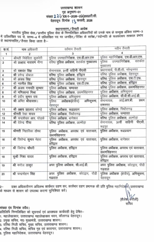 देहरादून 13 फरवरी । प्रदेश में बढ़ते अपराधों और बिगड़ती कानून-व्यवस्था के बीच शासन ने बड़ा प्रशासनिक कदम उठाते हुए पुलिस महकमे में व्यापक स्तर पर तबादले कर दिए हैं। गृह विभाग से जारी आदेशों के अनुसार कई संवेदनशील जिलों के वरिष्ठ पुलिस अधिकारियों को इधर-उधर किया गया है।