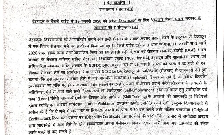 भारत सरकार के मंत्रालयों की संयुक्त पहलः देहरादून, रेंजर्स ग्राउंड में 26 फरवरी को दिव्यांगजनों के लिए विशेष ‘रोजगार मेला’