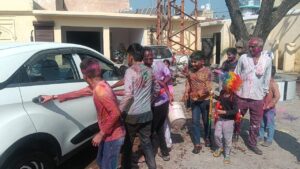 रंगों की इस ‘बारिश’ से बचने के लिए दिनेश उर्फ मोदी जान बचाकर कार की ओर भागे, लेकिन यहां भी किस्मत ने साथ नहीं दिया। कार में बैठे चालक ने अंदर से गेट लॉक कर लिया। बाहर खड़े मोदी खिड़कियां खोलने की कोशिश करते रहे, मगर नाकाम रहे। पीछे से बच्चे हंसी-ठहाकों के साथ लगातार रंग डालते रहे, जिससे माहौल और भी रंगीन हो गया।