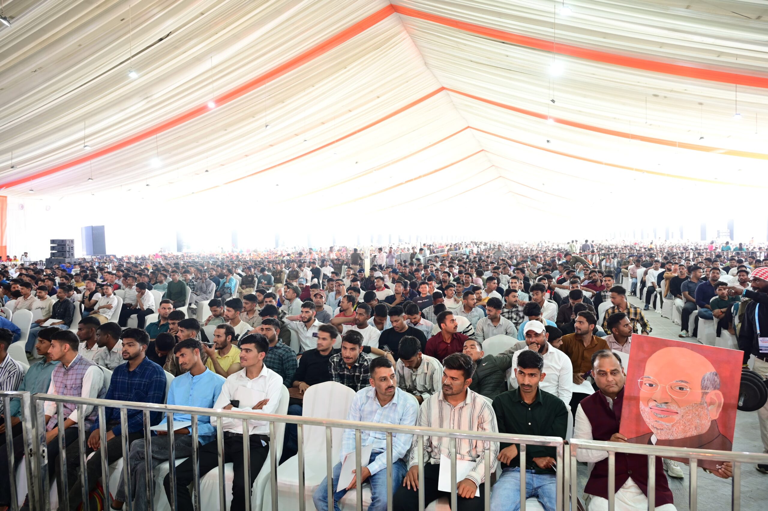 केंद्रीय गृह मंत्री अमित शाह ने अपने संबोधन की शुरुआत जनसमुदाय से ‘भारत माता की जय’ का नारा लगवाकर की, जिसके साथ पूरा परिसर देशभक्ति के उत्साह से गूंज उठा।