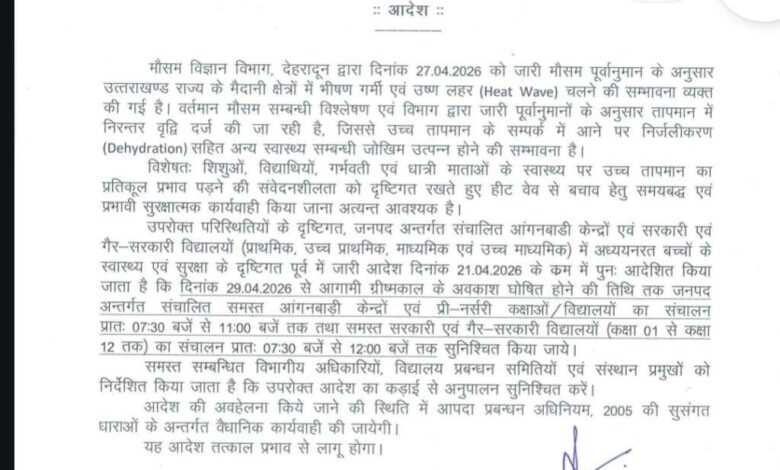 उपरोक्त परिस्थितियों के दृष्टिगत, जनपद अन्तर्गत संचालित आंगनबाडी केन्द्रों एवं सरकारी एवं गैर-सरकारी विद्यालयों (प्राथमिक, उच्च प्राथमिक, माध्यमिक एवं उच्च माध्यमिक) में अध्ययनरत बच्चों के स्वास्थ्य एवं सुरक्षा के दृष्टिगत पूर्व में जारी आदेश दिनांक 21.04.2026 के क्रम में पुनः आदेशित किया जाता है कि दिनांक 29.04.2026 से आगामी ग्रीष्मकाल के अवकाश घोषित होने की तिथि तक जनपद अन्तर्गत संचालित समस्त आंगनबाड़ी केन्द्रों एवं प्री नर्सरी कक्षाओं/विद्यालयों का संचालन प्रातः 07:30 बजे से 11:00 बजे तक तथा समस्त सरकारी एवं गैर-सरकारी विद्यालयों (कक्षा 01 से कक्षा 12 तक) का संचालन प्रातः 07:30 बजे से 12:00 बजे तक सुनिश्चित किया जाये।